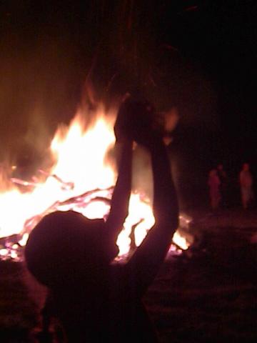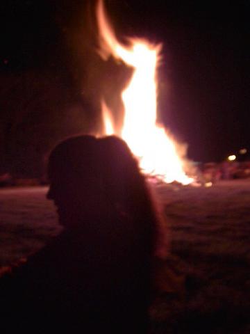 A young drummer stands before the flames. After running about a tag with the other children, he cried out and stuck this pose before resuming his play.