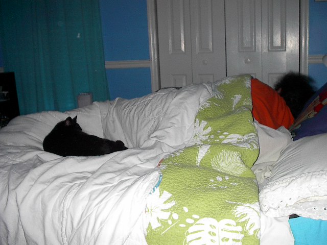 When I think of thunderstorms, like last night, I can immerse myself in the experience of heavy rain drumming on glass, on windowsills, pattering in pools to the murmur and growl of thunder, with flashes of lightening that both amaze and petrify. But mostly, I think of my son in the closet with his cat inside a pillowcase, a Nintendo DS on so they can have light, while he reads a story to soothe the kitty.