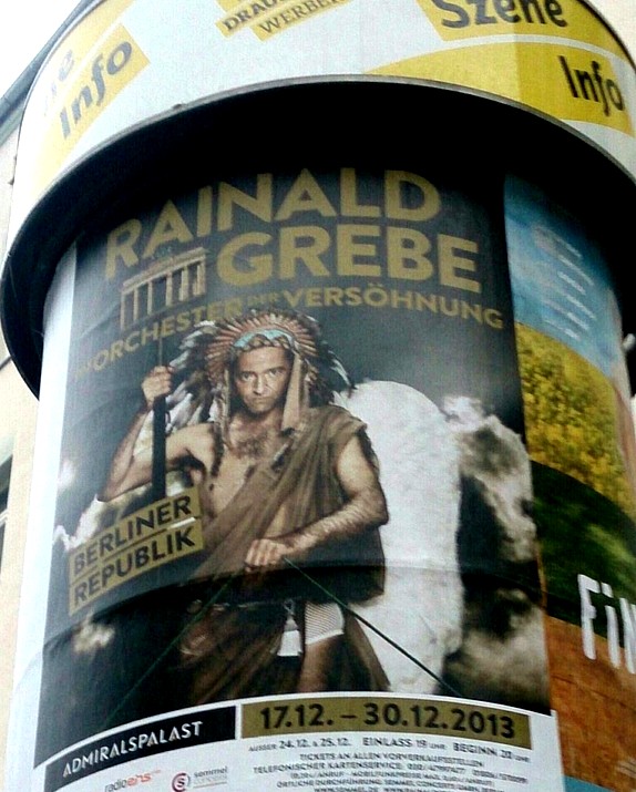That’s the intro for one of Rainald Grebe’s stage shows. It is not funny. Upcoming December, beyond just appearing a comical figure, Herr Grebe has decided to go all-out in his Indian “costume” this time, and thousands of posters can be seen across Berlin showing this kind of cultural abuse long substantiated as harmful to both Natives and non-Natives by social scientists (American Psychological Association, 2005).