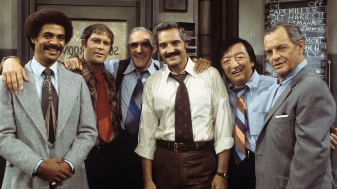 “Barney Miller” cast in 1976: Ron Glass, Max Gail, Hal Linden, Abe Vigoda, Jack Soo & James Gregory.