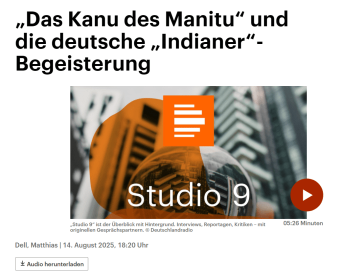 An interview wtith Matthias Dell, who I first met in 2017 when he contacted me for an article in der Freitag on our documentary and related topics. Follow the link to listen to the interview at Deutschlandfunk Kultur. Sound clips of the documentary are included, such as of Dr. Hartmut Lutz and Gerald Dittmer (Ho-chunk). Interested in a screening for your organization, university or group? Here.